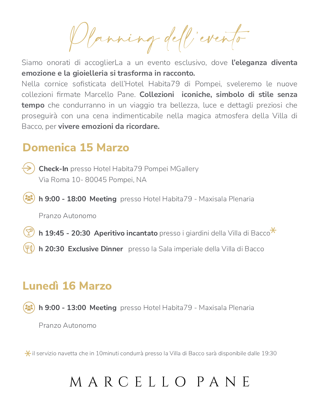 We are honored to welcome you to an exclusive event, where elegance becomes emotion and jewelry transforms into a story. In the sophisticated setting of the Habita79 Hotel in Pompei, we will unveil the new collections by Marcello Pane. Iconic collections, symbols of timeless style, will take you on a journey through beauty, light, and precious details, culminating in an unforgettable dinner in the magical atmosphere of the Villa of Bacchus, for a memorable experience.